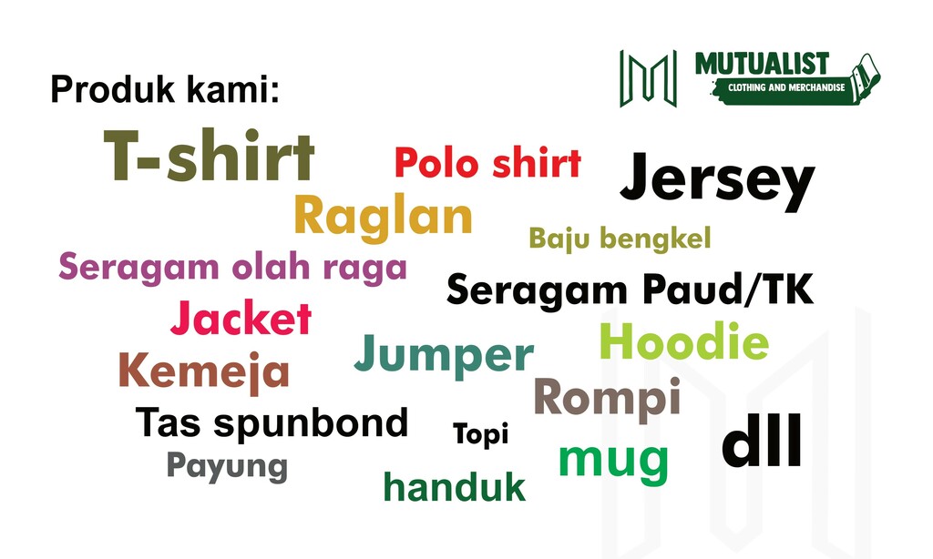 MUTUALIST CLOTHING adalah perusahaan yang bergerak di bidang jasa Konveksi, Percetakan, dan Merchandise. Kami telah beroperasi sejak 2009 dan terus meningkatkan kualitas pelayanan untuk konsumen. Saat ini, kami menawarkan jasa konveksi untuk pembuatan seragam kerja, t-shirt, jaket, dan lainnya.